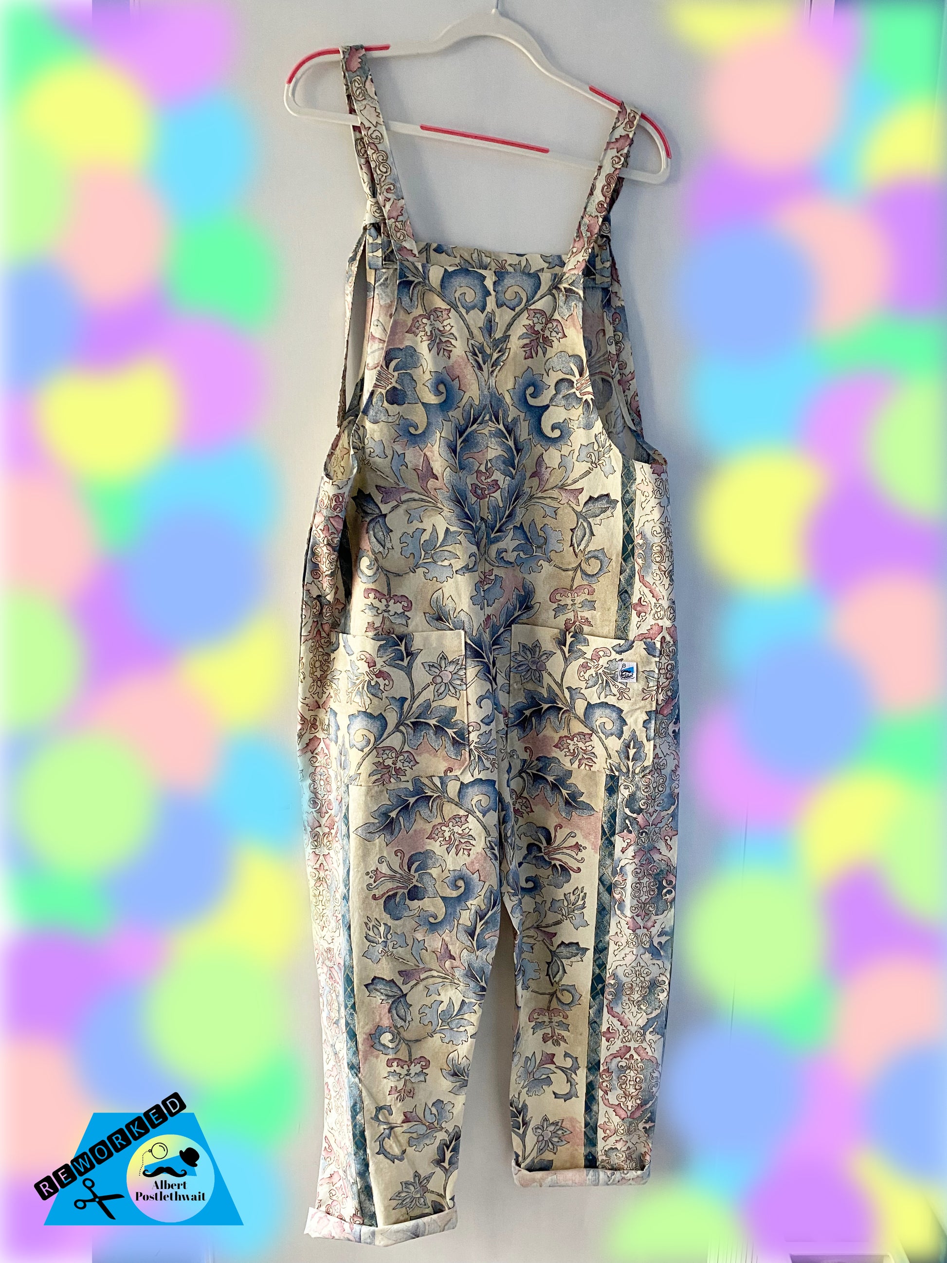 Curtain Dungarees featuring a floral print. Fastens with ties on the front which can be adjusted. There are five pockets. Two on the back, two on the lower front and a breast pocket. The bottoms are fully hemmed, so can be rolled up or down with preference.